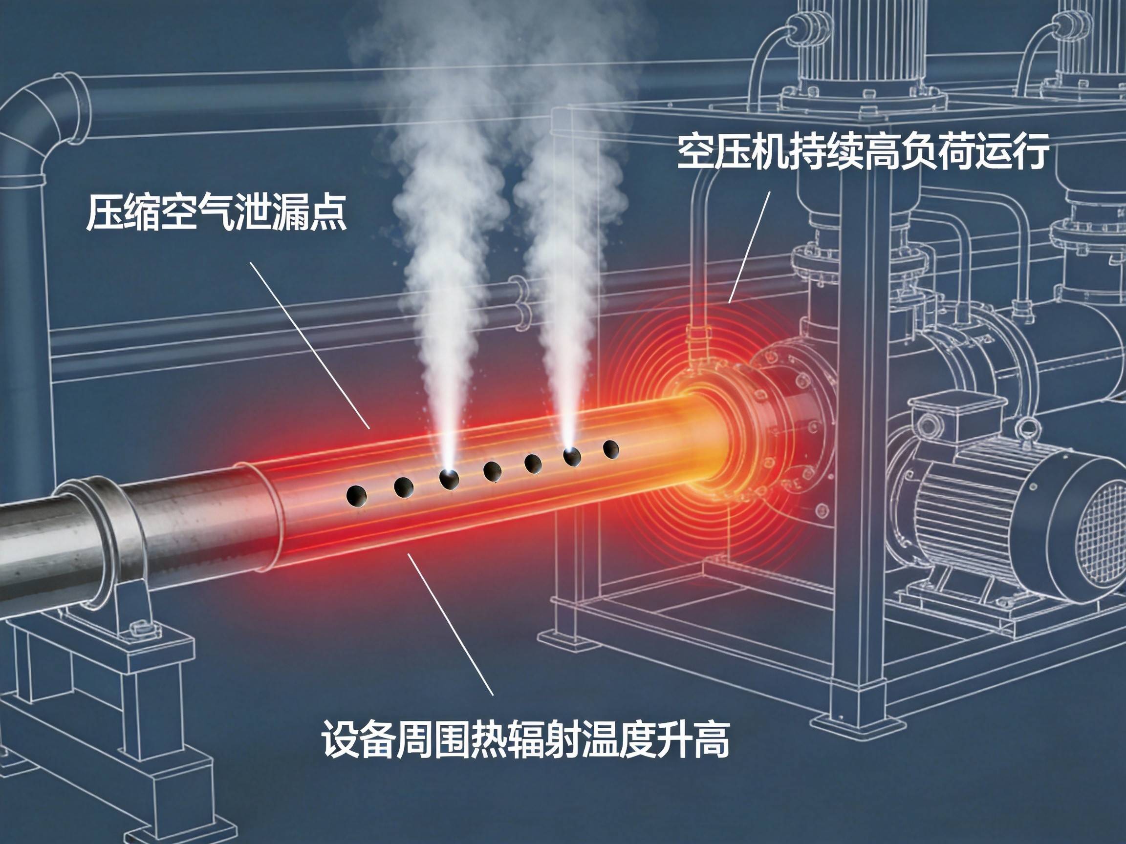泄漏迫使空压机更多时间处于加载状态,让电机长期高负荷运行,导致其工作温度持续偏高。