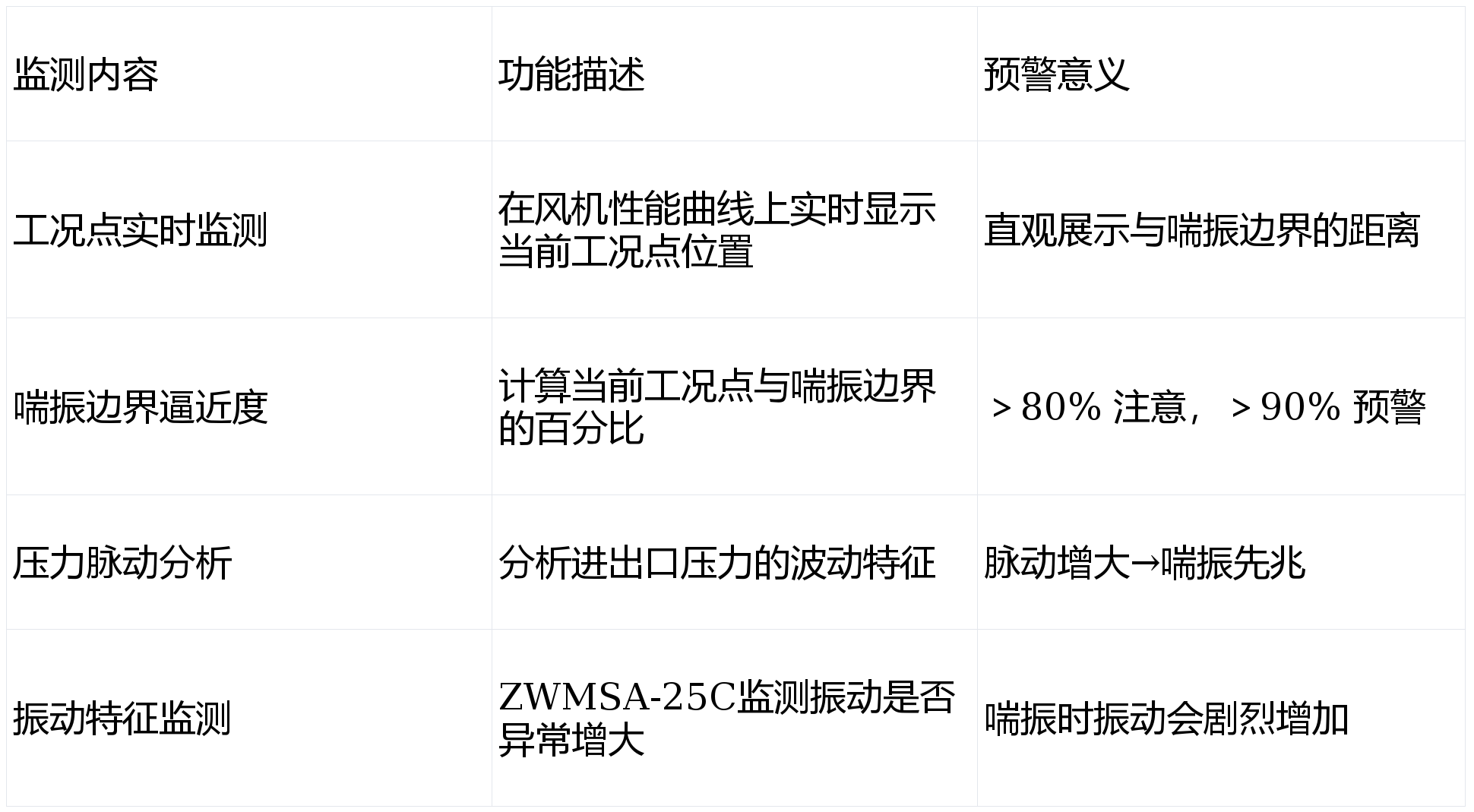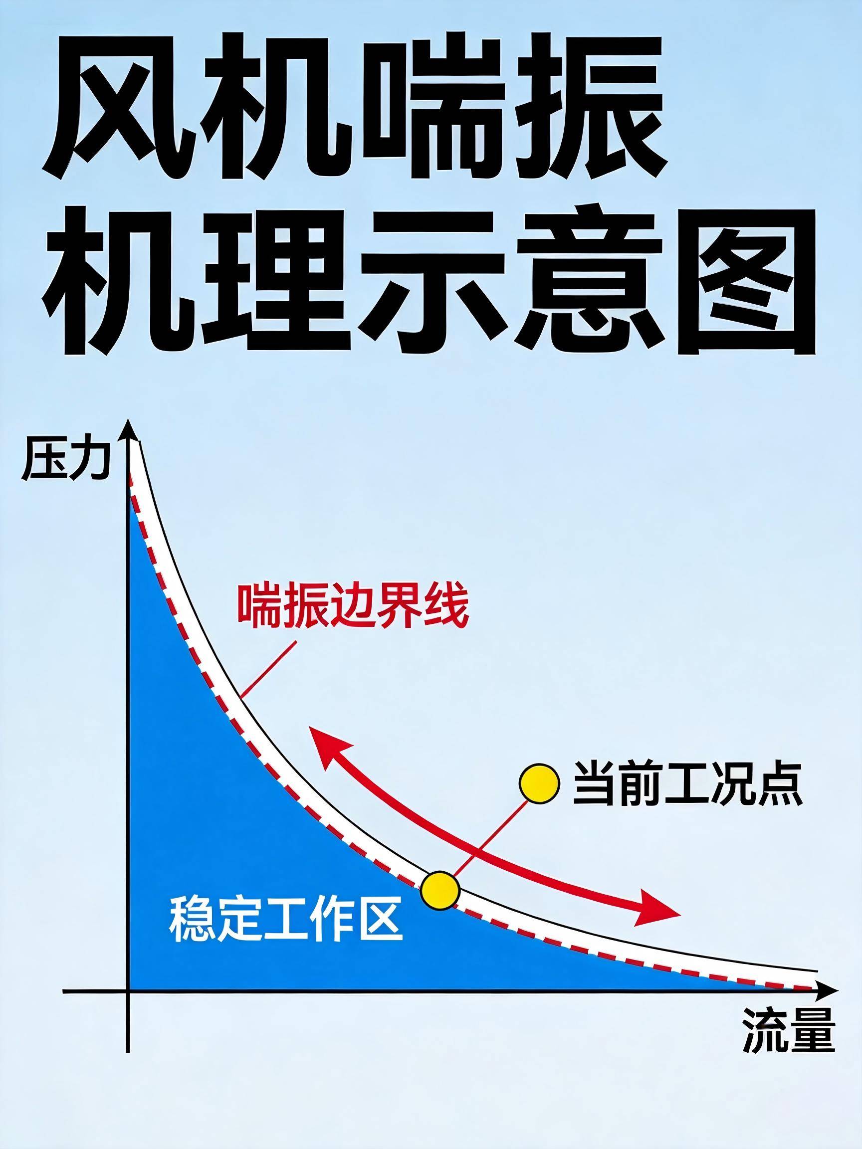 喘振是风机最危险的故障之一,表现为风量、风压周期性大幅波动,伴有剧烈振动和异常噪声。喘振发生时,风机工况点进入不稳定区,可能造成叶片断裂、设备损坏。本方案通过监测风机进出口压力、流量、振动等参数,结合风机性能曲线,实时计算工况点位置,建立喘振预警模型。