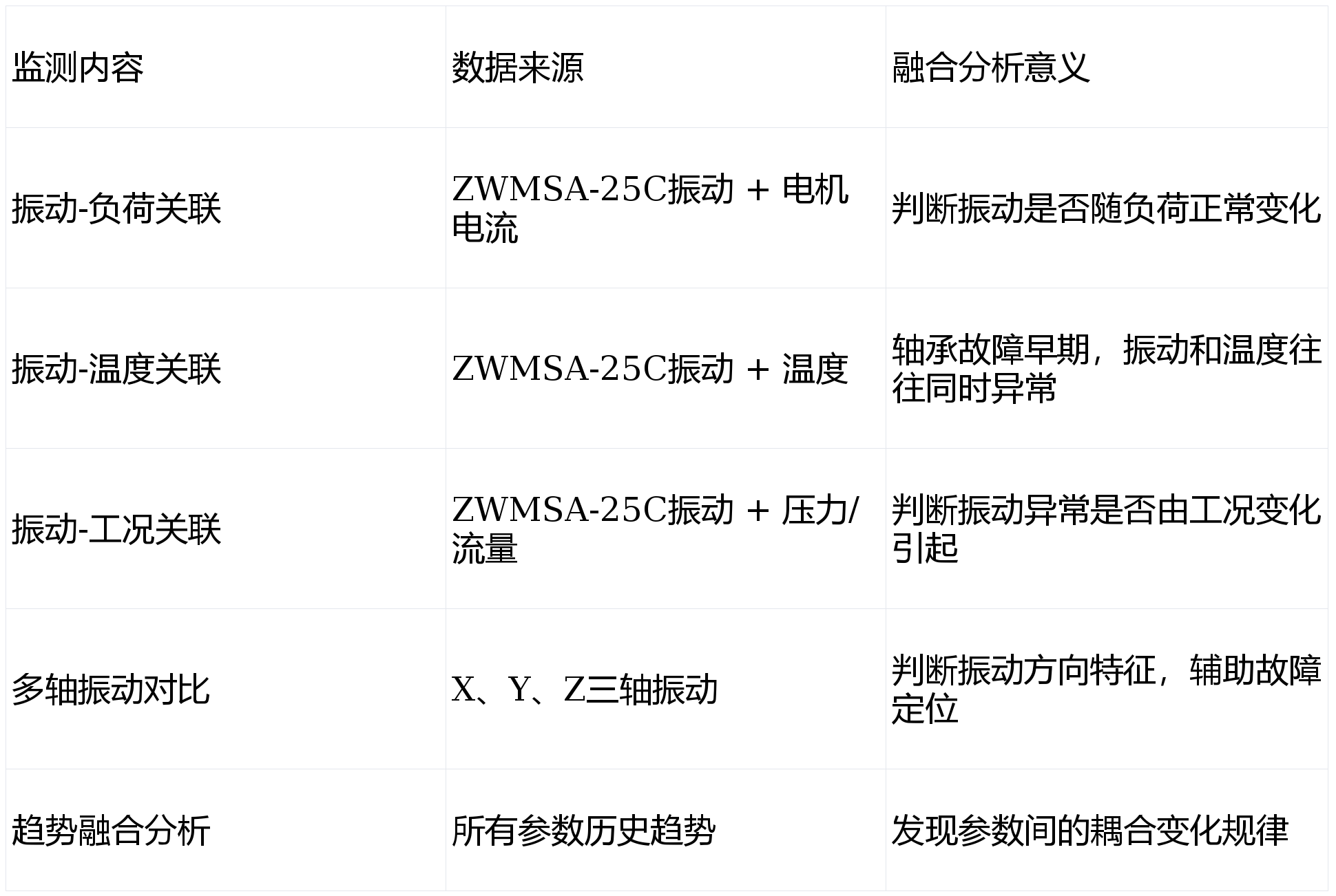 风机故障往往是多种因素共同作用的结果,单一参数监测难以全面评估健康状态。多参数融合监测系统整合ZWMSA-25C的三轴振动、温度数据,结合工艺参数(压力、流量、电流),利用综合分析模型,实现从“单一参数报警”到“多参数融合诊断”的跨越。