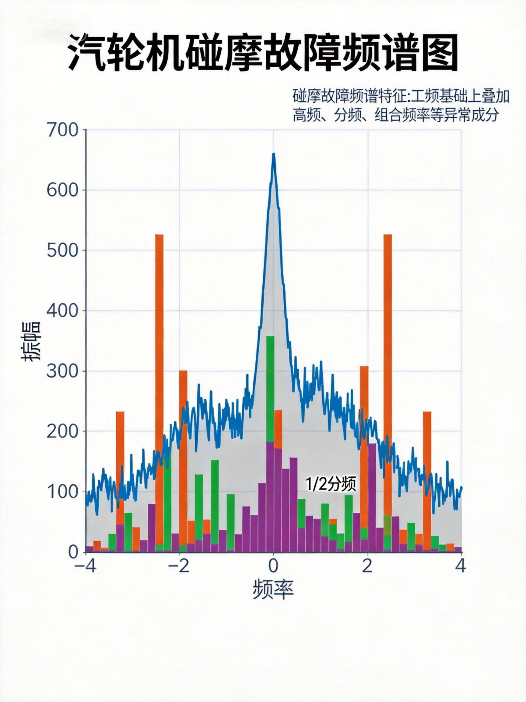 正常运行时,振动频谱以工频分量为主。但发生碰摩时,由于非线性力的作用,频谱中会出现多种异常成分:
