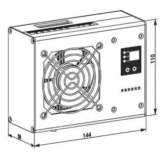 智能除湿装置主机外形尺寸为 143×110×58mm;可采用支架安装或导轨式安装;支架安装孔距为90mm ,安装孔直径为Φ6mm;导轨式安装尺寸可采用 35mm 导轨进行安装