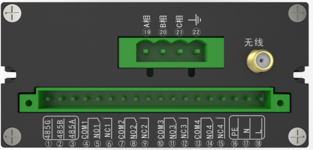485G | 485B | 485A | COM1 | NO1 | NC1 | COM2 | NO2 | NC2 | COM3 | NO3 | NC3 | COM4 | NO4 | NC4 | PE | N | L |