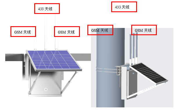 将433MHz天线、GSM天线分别拧紧在基站的上方对应位置(433MHz天线安装在中间,GSM天线安装在左右两侧)。