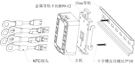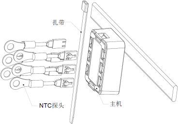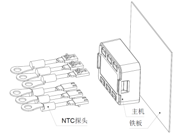 2.4. 将NTC探头的套环处安装在电气节点的螺栓上后接入主机,并且记录安装点,主机上最小两个编号探头确认有电才能运行, 如下图。
