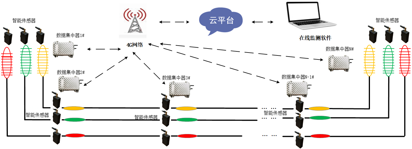 数据集中器与智能传感器配合,利用本地无线组网技术接收传感器发送的电缆运行状态信息;再通过4G网络以NB-iot的方式向监控主站转发检测信息。