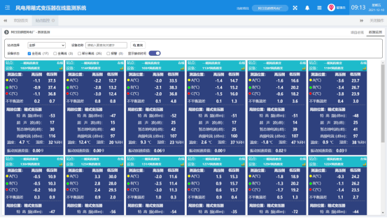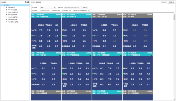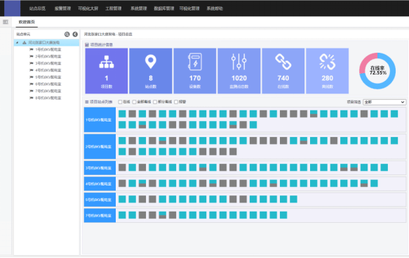 项目监测:站点监测分为“数据监测”、“一次图监测”、“实时报警”、“历史报警”、“历史趋势”和“统计报表”,综合辅助电网分析柜体的运行状态以及潜在隐患,下图所示项目数据监测图: