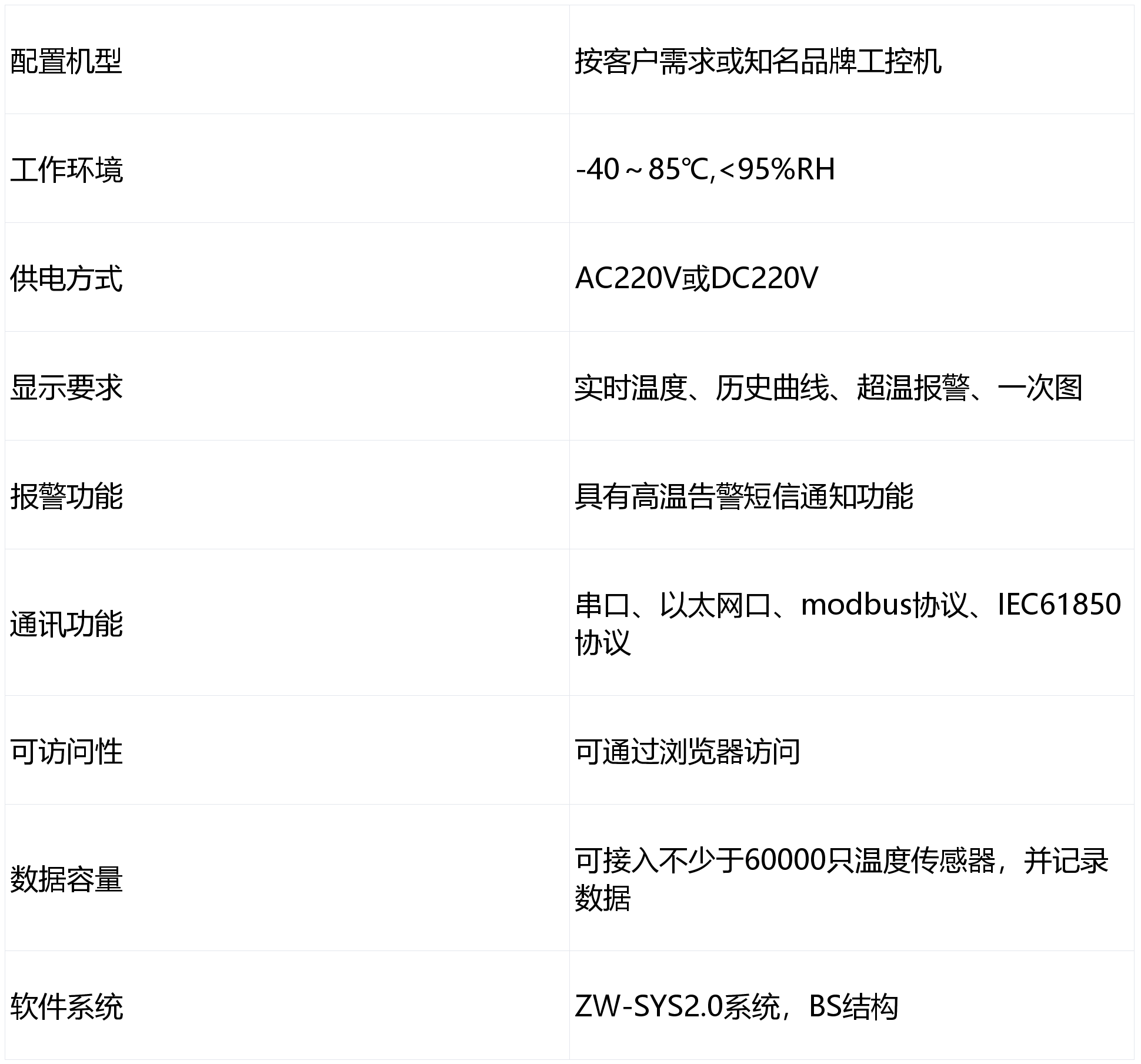 4.后台功能:监控后台采用BS结构,具备通讯数据接收、处理、存储、显示、报警提示灯功能,显示界面包括概括图、详细图、曲线图、一次图;超温报警门限可设,支持短信提示;所有数据记录并存储。