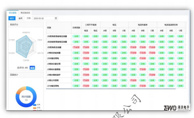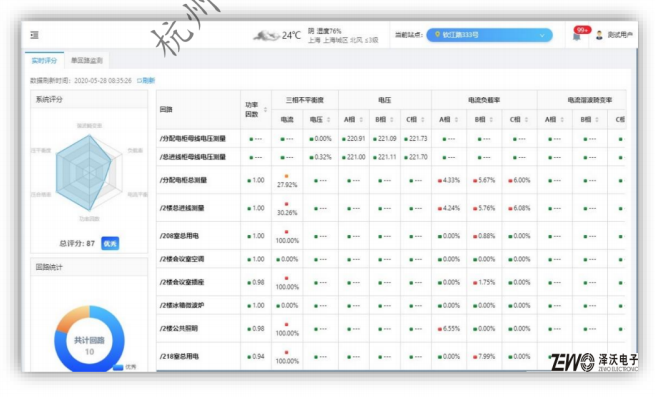 查询显示各回路的电能质量实付监测信息,包括功率因数、三相不平衡、电 压谐波、电流谐波畸变率、负载率等。以雷达图、环形图给出电能质量综合评分。