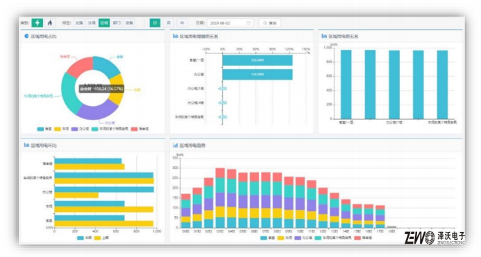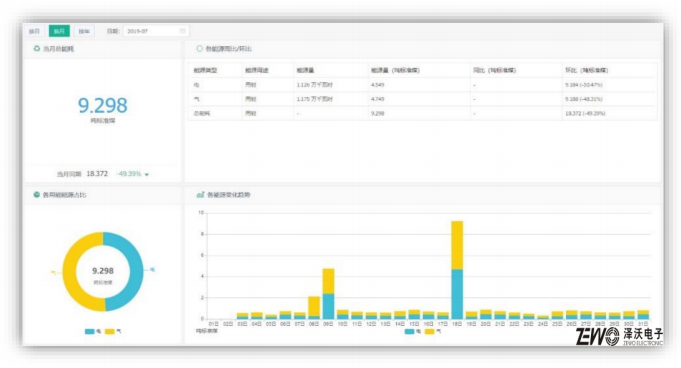 分类、分项、分区域、分部门统计用能信息,通过图形化的方式直观呈现一 段时期内的用能情况,包括用量、趋势、健比、排名等。帮助企业分析出能耗最 高的区域、部门等,以便企业有针对性地采取节能措施。