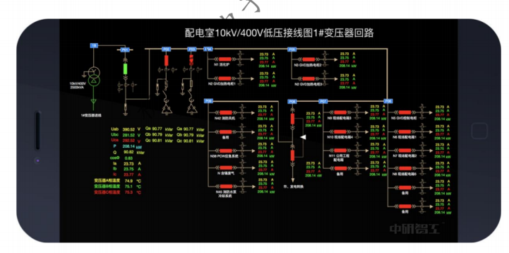 APP 上可查看变电站一次系统图,采用 H5 矢量图方式,画面数据实时更新。每个变电站最多可支持 128 个画面,同时支持自动根据画面布局切换手机横竖屏。