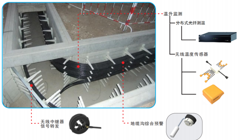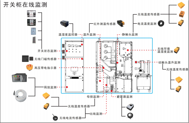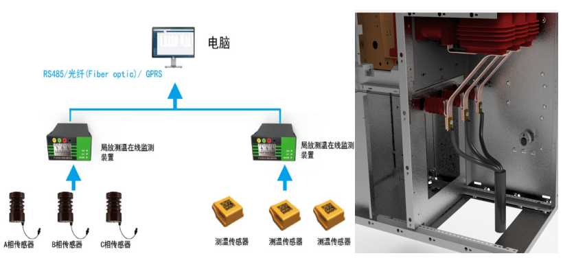 开关柜无源无线温度在线监测子系统:通过使用无源无线测温传感器对高压开关柜中的断路器触头(动/静触头)、母排、电缆出线接头等位置的运行温度进行监测。当测温点的温度超过安全设定温度值和安全温升速率时,自动发出报警和预警信号。高压开关柜、环网柜、高压线缆接头、刀闸开关等重要设备,在长期运行中可能出现设备老化,表面氧化、腐蚀,紧固螺栓松动等问题。加上很多电力设备长期高负荷运行,容易引发温度异常。如不及时发现处理,可能引起熔融、燃烧甚至爆炸等安全事故。