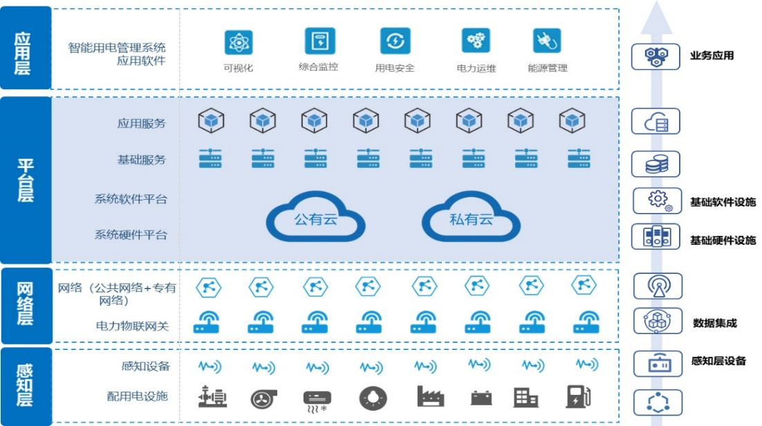 智慧电力数字运维监管平台配置必要的硬件和软件,提供系统运行所需的基础服务和应用服务。应用软件采集各站点数据,实现运行监测、综合监控、用电安全、能耗管理和运维管理等功能。应用软件支持WEB端、移动APP端、大屏幕等多种展示形态。