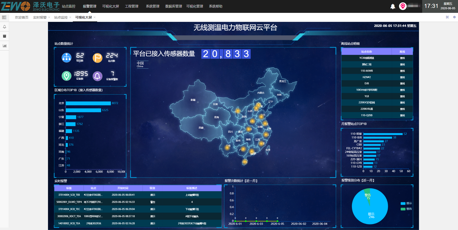 在能源需求激增与极端天气频发的背景下,电网安全运行面临严峻挑战。高压输电线路的塔杆倾斜、导线温度、微风震动、导线舞动等状态参数是监控重点。同时,设备电气接点因接触不良(如制造缺陷、污染、老化、过载等)导致持续发热升温,极易引发熔断等事故,威胁供电可靠性。因此,输电线路的倾斜、温度、震动、雷击风险,以及设备接点的温度越限、过流过压、局部放电、绝缘破坏、异常震动等现象,已成为保障电力供应安全急需智能化监控与预警的关键问题。为此,我司为某电力公司针对性设计了电力系统及电气设备智能化数字运维综合监管平台系统。