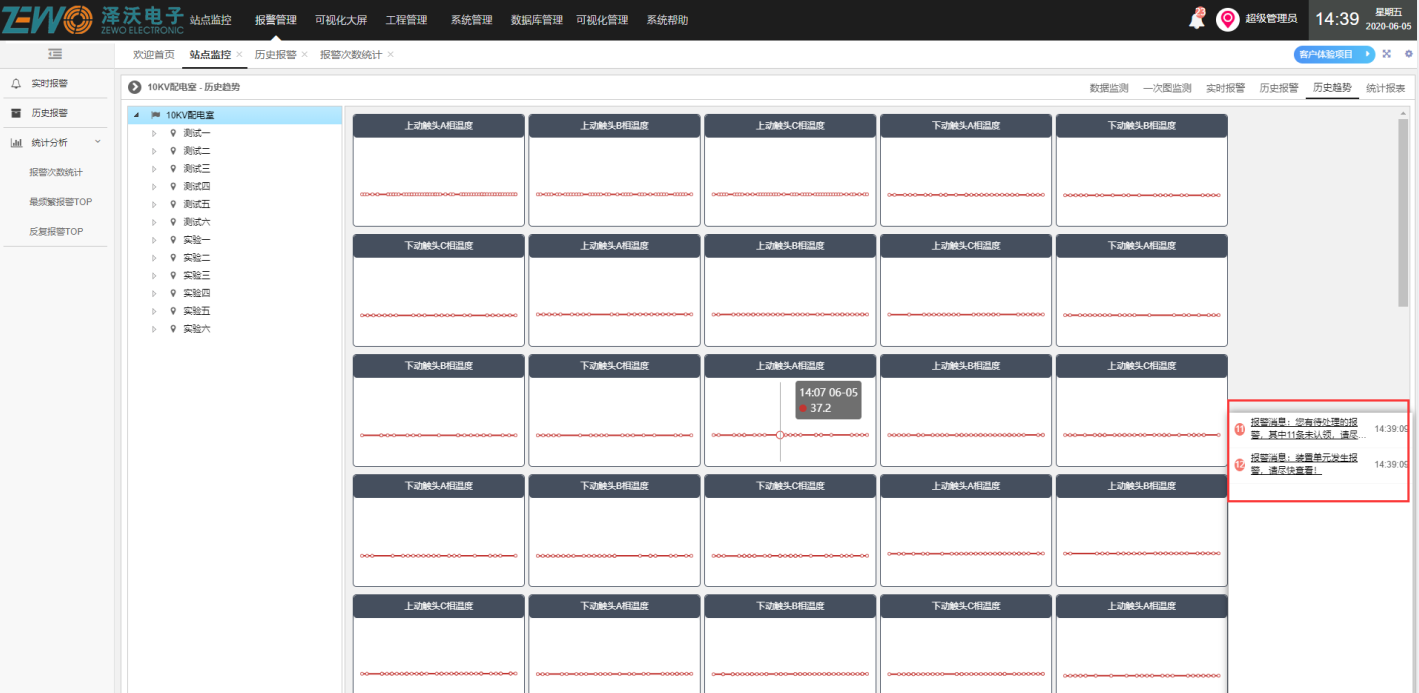 实现全天24小时不间断在线监测,监测数据一越限即报警