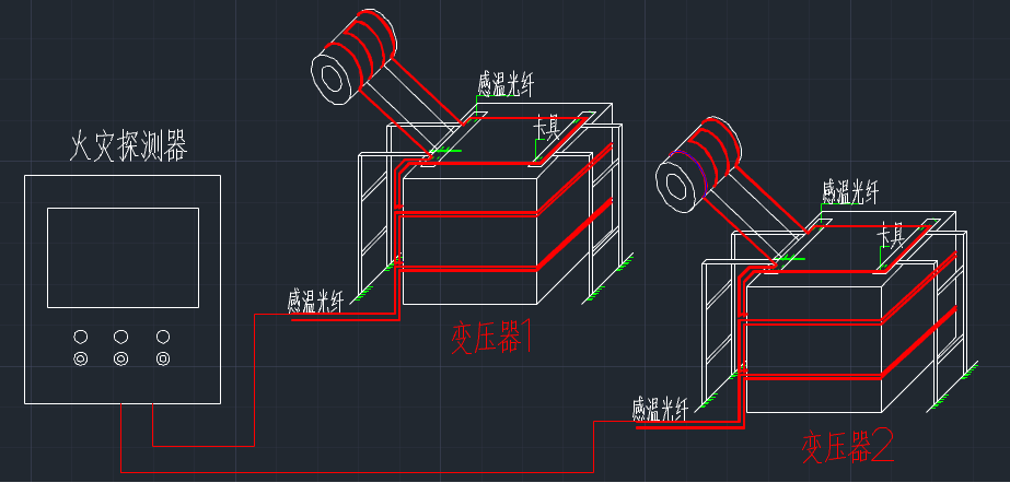 变压器外壳温度监测采用1米空间分辨率的光纤测温主机。光纤采用阻燃非金属多模光纤。通过监测外壳温度,来反映内部冷却油温的变化,从而达到监测变压器运行状态的目的。