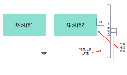光伏板立杆安装在箱体围栏内,立杆约2m,搭载2块光伏板,逆变控制设备,蓄电池,空开安装在离地控制箱内。