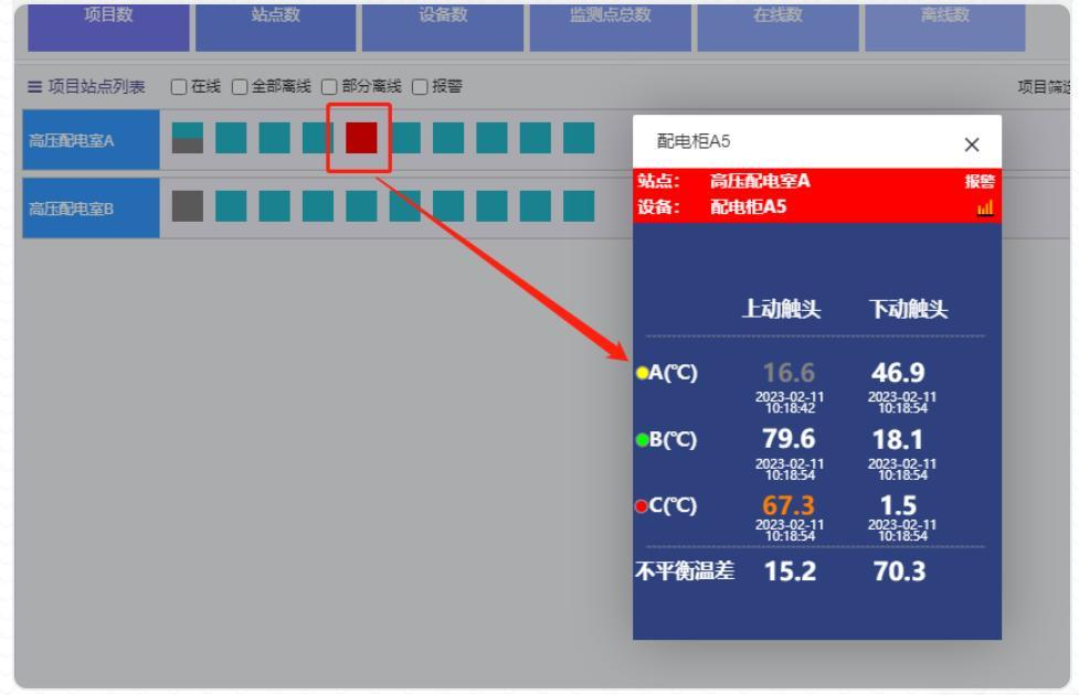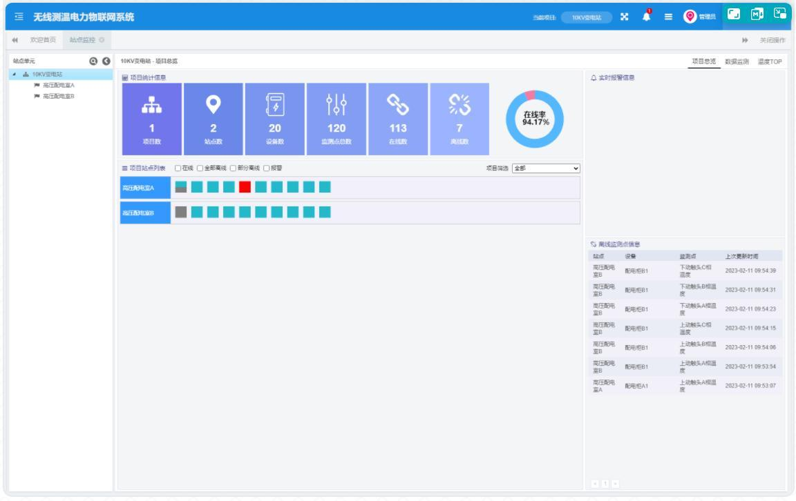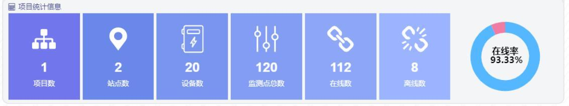 项目基本情况: 在线统计项目数量、站点数量、设备数量、总监测点数量、在线 监测点数量、离线监测点数量,同时采用柱状图显示各站点各自的监测点的数量。 站点信息详情: 显示各站点下面的设备(例:配电柜)数量、站点总的监测点数 量以及监测点的在线率。