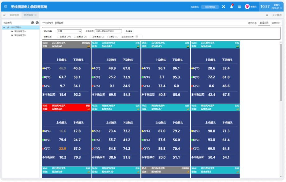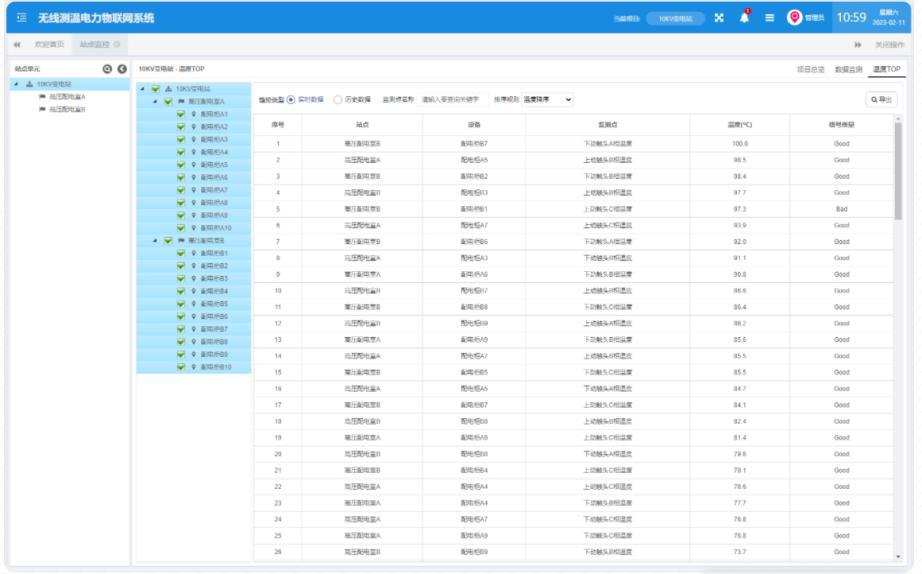 实时监测点信息(TOP10): 将当前在线监测点的温度值从高到低取 TOP10 进行排 序监测。