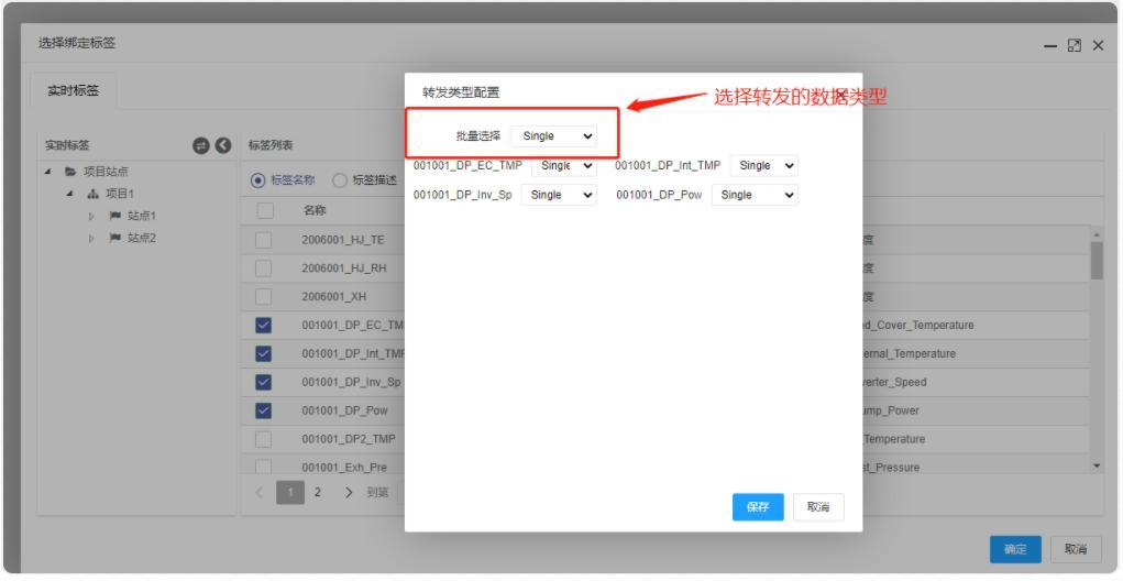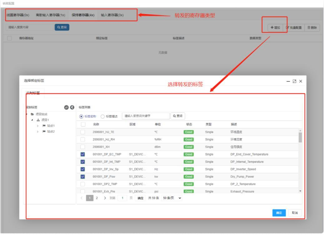 选择 MODBUS 寄存器类型,再点击新增,选择需要转发的标签及转发的数据类型: