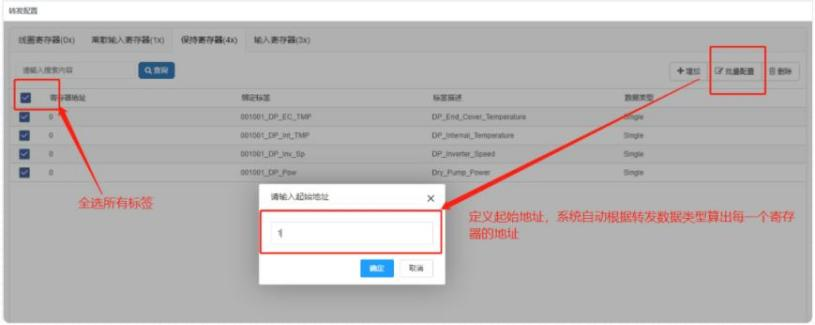 批量全选所有标签,然后设置这些标签转发的起始寄存器地址,系统自动根据标 签转发类型及起始寄存器地址算出每个转发标签对应的寄存器地址: