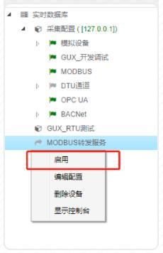 右键创建的转发服务,选择启用,然后用第三方测试工具与 MODBUS 转发服务连 接,测试是否成功。