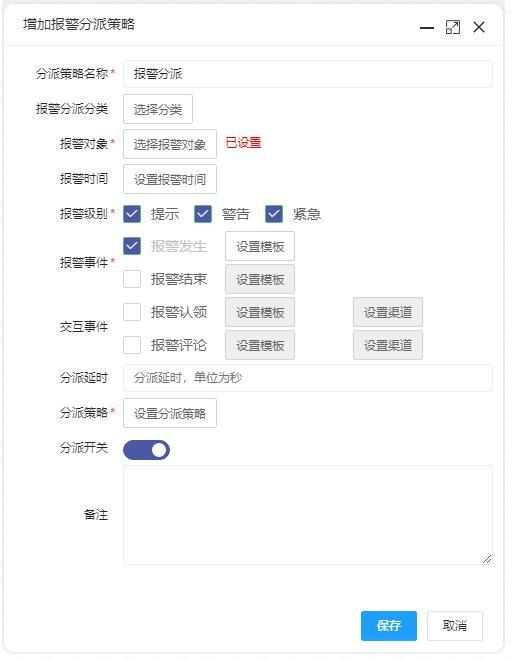 报警分派指的是报警触发后用什么渠道(页面通知、短信… )告诉指定人员报警 信息的策略配置。