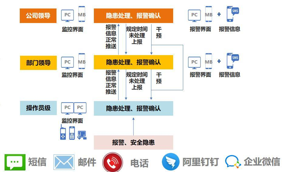 基于实时数据库的标签实时数据,进行报警策略的配置,实现对物联网重点 参数进行实时报警监控,并结合时间、区域、报警级别等通过邮件、短信、企业 微信、阿里钉钉等多种渠道推送到指定的负责人员,进行自动提醒,并支持根据 不同的异常处理时长进行逐级推送,通知不同层级的关注人员,减少传统报警上 报流程,加快报警事件处理,保证生产的安全可靠。