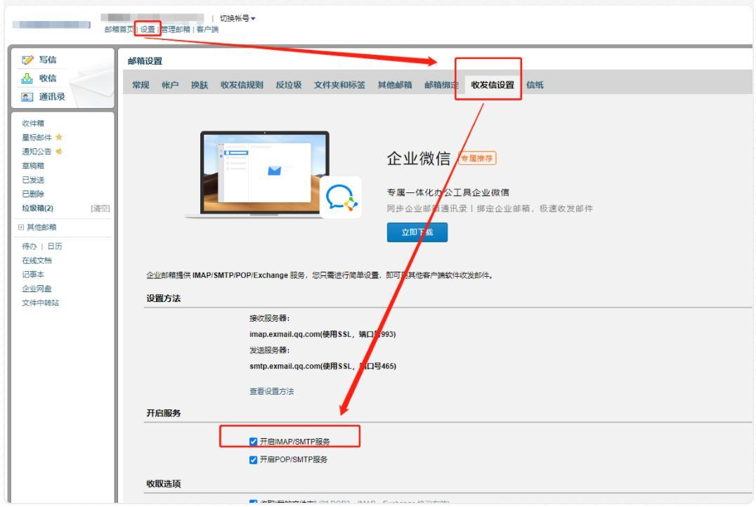 在邮件侧开启 SMTP 服务(以腾讯企业邮件侧为示例):