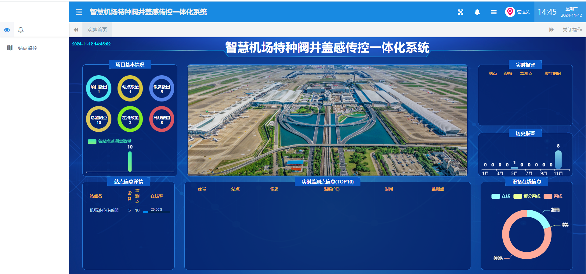 由于各类原因,机坪阀井在雨后极易积水,而根据相关管理条例,井室内积水应当及时排空:机坪上的井室空间较大且数量较多(约100处);每次的巡查时间久、处理时间长,对人力和物力有较大消耗。针对实际情况,我们研发了停机坪井道无线智能液位监测系统,其基础功能包含液位检测、井室位置显示、开启记录功能:目的是对井室内的水位进行监测,当水位到达警戒线时做出明显的警示;使用方在收到提示后再通过位置能精准的、有计划的执行工作任务,提高了工作效率,为企业节约人力、能源的消耗。