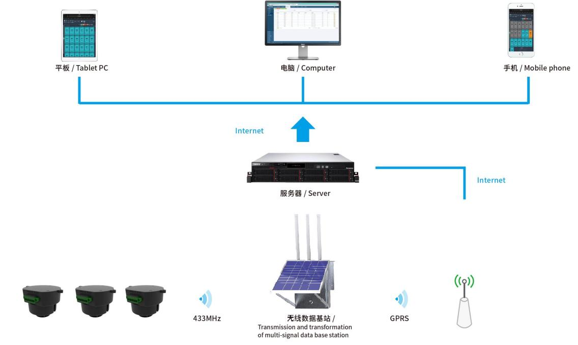 分散/集中架构:依据采集分散、数据集中的设计框架,可根据系统规模,将采集器分散布置,采集器会自动向物联网主机注册并传输数据,由物联网主机提供高效的集中管理。